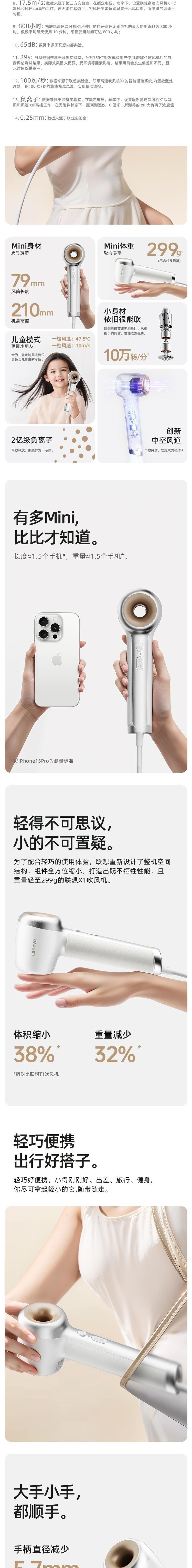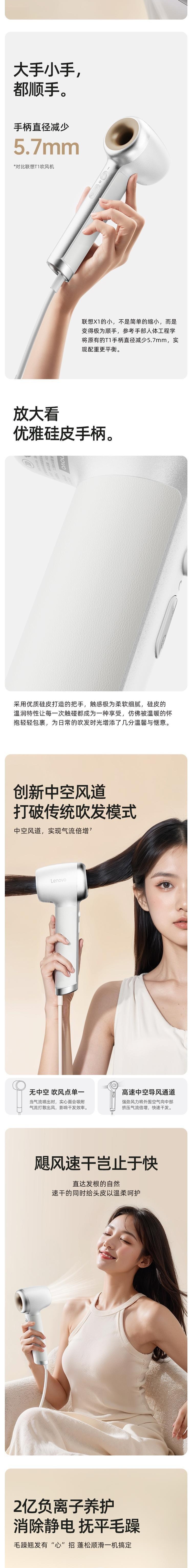 联想高速吹风机X1(型号:L-HDX001)采用无叶设计,机身轻巧便携,净重仅299g(不含电源线),体积比前代产品缩小38%,重量减少32%,长度约210mm,风嘴长度79mm,整体尺寸紧凑,便于收纳与携带。配备新一代高速无刷电机,转速高达10万转/分,实现强劲风力输出,最大风速可达17.5m/s,干发效率显著提升,实测快速干发时间仅需29秒。创新中空风道设计,通过导流双风道结构将外部空气吸入并压缩增压,气流倍增,有效提升吹发效率。内置智能恒温算法,每秒监测100次风温,精准控温,避免过热损伤头发,同时具备4档风速、5档风温调节,共提供20种组合吹发模式,满足不同发质和造型需求。搭载2亿级负离子发生器,释放高浓度负离子,中和静电,抚平毛躁,改善发丝光泽度,使用后可使头发光泽度提升15%、顺滑度提升3%,毛躁感降低35%。手柄采用优质硅胶材质,触感柔软细腻,防滑耐磨,符合人体工学设计,手柄直径较前代减少5.7mm,握持更舒适,适合大手小手皆宜。配备磁吸式集风嘴,安装便捷,提升集中风力效果。整机采用硅皮工艺+喷漆处理,外观优雅,质感出众。电源线长度1.7米,插电式供电,额定电压220V,功率1200W,适用于家庭及旅行场景。此外,特别设置儿童模式,一档风温为47.5℃,风速10m/s,温和不伤发,专为儿童发质设计,兼顾安全与护发体验。电机使用寿命长达800小时,性能稳定可靠。