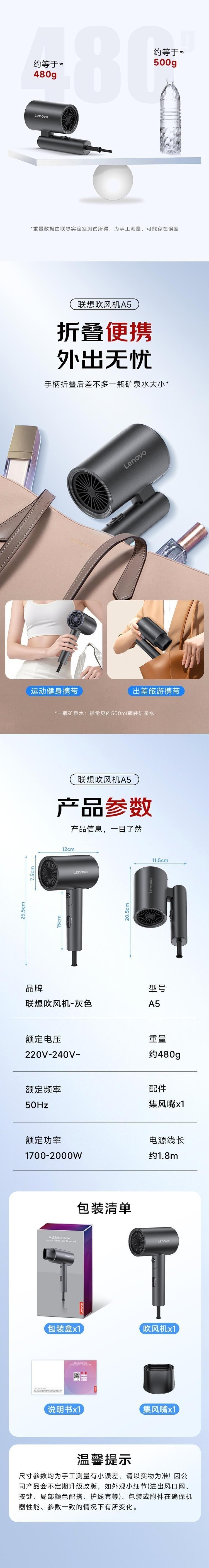 联想家用吹风机A5采用2000W大功率高转速电机,转速高达19000转/分钟,提供强劲风速达28m/s,能够快速高效地吹干头发,缩短吹发时间。其环形出风口设计使气流覆盖面积扩大两倍,避免局部高温烫伤,同时内置蓝光视觉效果提升科技感。产品具备自然冷热风双模式,热风可锁水护发,冷风则闭合毛鳞片,让发丝柔顺亮泽。配备智能过热保护系统,内置感温器在高温时自动断电,保障使用安全,并通过3C安全认证。机身采用阻燃材质,增强防火性能。手柄支持折叠设计,重量仅约480g,相当于一瓶矿泉水,轻巧便携,适合日常家用及出差旅行使用。此外,配备双层加厚防烫集风嘴,可灵活拆卸调节角度,有效集中气流;可拆卸隔离滤网防止灰尘和杂物进入,提升清洁便利性。电源线长约1.8米,加粗设计保证电流稳定,使用更安全可靠。