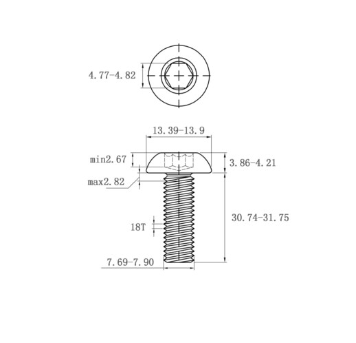 该内六角圆柱头螺钉采用304不锈钢材质,具有优异的耐腐蚀性、抗氧化性和抗疲劳性能,适用于高要求的工业环境。遵循ANSI/ASME B18.3BT标准,确保尺寸精度与互换性,适合精密装配需求。公称直径为5/16英寸(约7.94mm),螺距为18牙(粗牙),长度为1-1/4英寸(约31.75mm),螺纹覆盖范围为全牙,可提供充分的连接强度。头部设计为平圆头,顶部呈半球形,便于在有限空间内安装,并减少对表面的损伤。内六角孔对边距离为4.77-4.82mm,配合标准内六角扳手使用,拆装方便且不易打滑。表面处理为本色(无镀层),保留了不锈钢原有的金属光泽和防腐特性,同时具备良好的外观质感。整体结构紧凑,机械性能稳定,适用于需要高强度、高可靠性的固定场合。