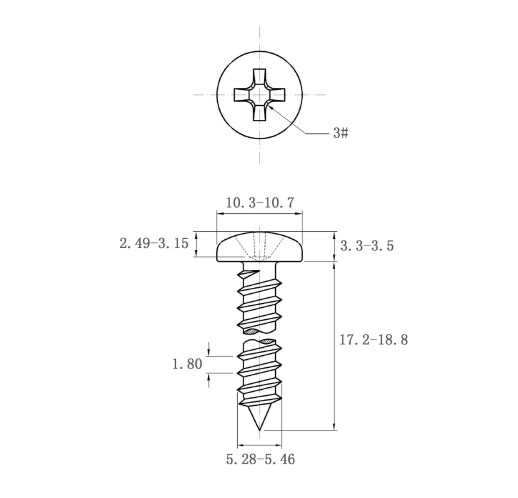 规格精准:型号155584,规格为ST5.5×18,技术参数严格把控:螺纹直径5.28 - 5.46mm,螺纹长度17.2 - 18.8mm,头部直径10.3 - 10.7mm,头部厚度2.49 - 3.15mm,头部高度3.3 - 3.5mm,螺距1.80mm,十字槽为3#,尺寸精度高,适配对应安装场景的紧固需求。