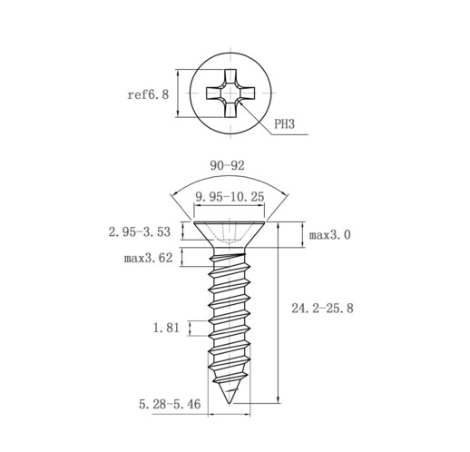 规格参数:螺纹规格为ST5.5,长度25mm(实际长度范围24.2 - 25.8mm),螺纹直径5.28 - 5.46mm,满足中等强度连接需求;头部为沉头结构,头部直径9.95 - 10.25mm,高度2.95 - 3.53mm,安装后可使被连接件表面保持平整,适配对外观平整度要求高的场景。