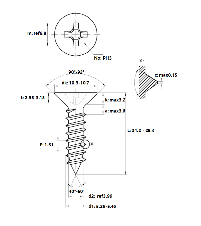 结构设计:十字沉头结构,头部角度90°-92°,头部直径dk为10.3-10.7mm,安装后表面平整,不影响外观且减少磕碰风险;十字槽型号为PH3,适配对应规格的十字螺丝刀,便于安装操作。