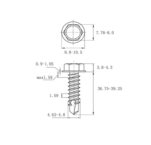 尺寸精度高,头部直径9.8-10.5mm,头部厚度3.8-4.3mm,总长度36.75-39.25mm,螺纹规格匹配ST4.8标准,连接牢固稳定