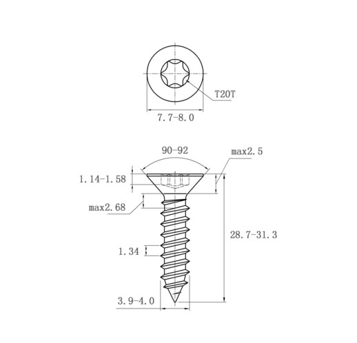 规格参数:规格为ST4*30,螺纹牙型与螺距设计合理,自攻性能优异,可快速攻入木材、塑料、薄板等基材,提升安装效率;从技术图纸可知,头部直径7.7 - 8.0mm,沉头角度90 - 92°,螺纹部分直径3.9 - 4.0mm,螺纹牙高1.34mm等参数精准,保障安装稳定性。