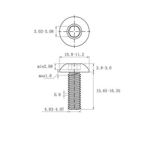 规格精准适配:规格为M5×16,螺纹直径5mm、总长度15.65 - 16.35mm(螺纹牙距约0.8mm),适配多种M5螺纹孔的安装需求,尺寸公差严格(如头部直径、高度、螺纹相关尺寸均有精准范围),保证安装的适配性与稳定性。