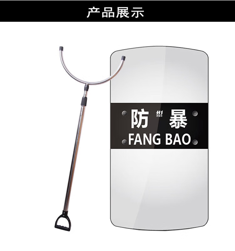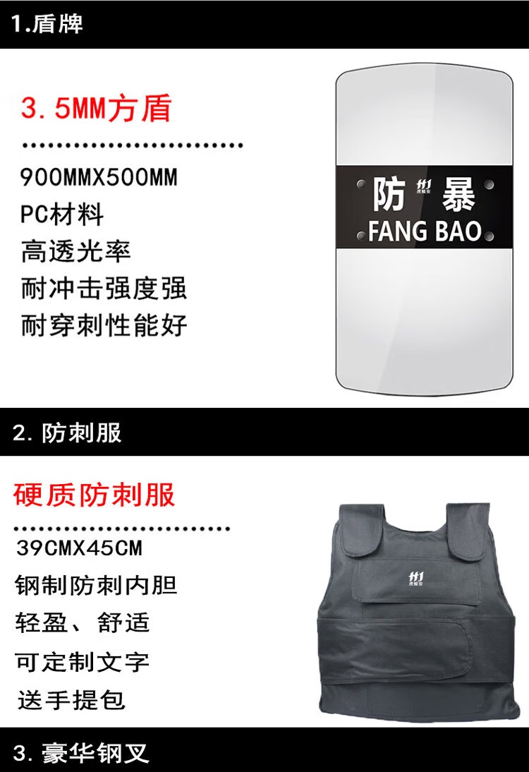 盾牌:采用3.5mm厚PC材料,尺寸为900MM×500MM,具备高透光率、耐冲击强度强、耐穿刺性能好的特点,可为使用者提供正面防护。