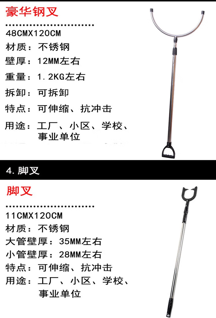 脚叉:不锈钢材质,尺寸11CM×120CM,大管壁厚约35MM、小管壁厚约28MM,可伸缩、抗冲击,辅助控制危险目标。