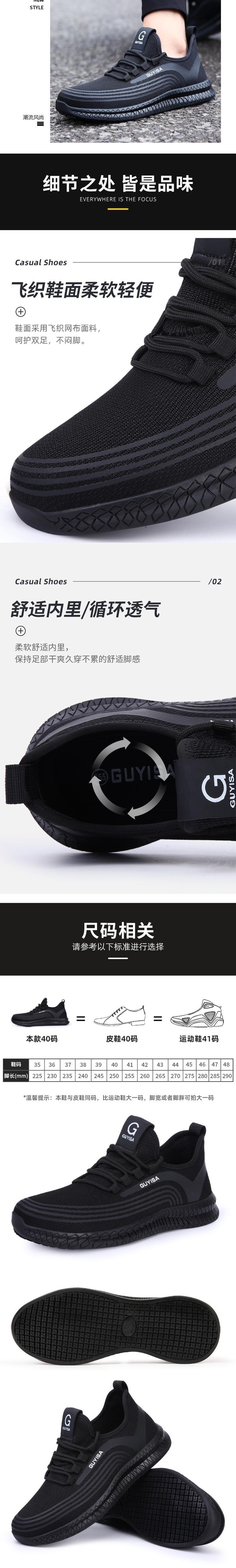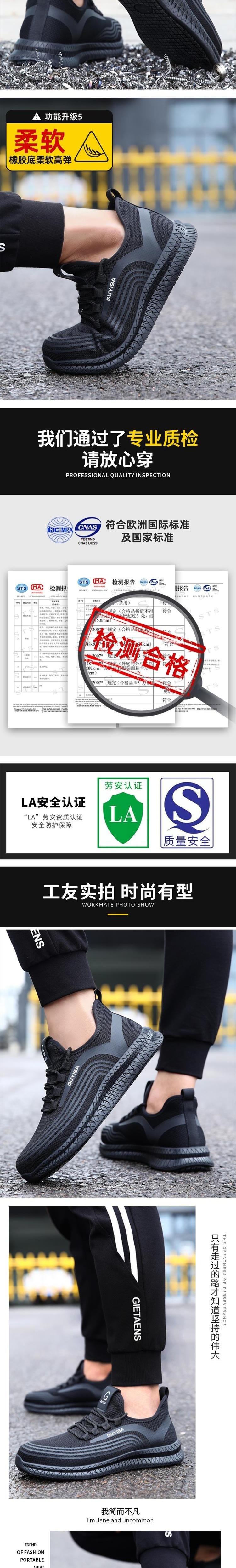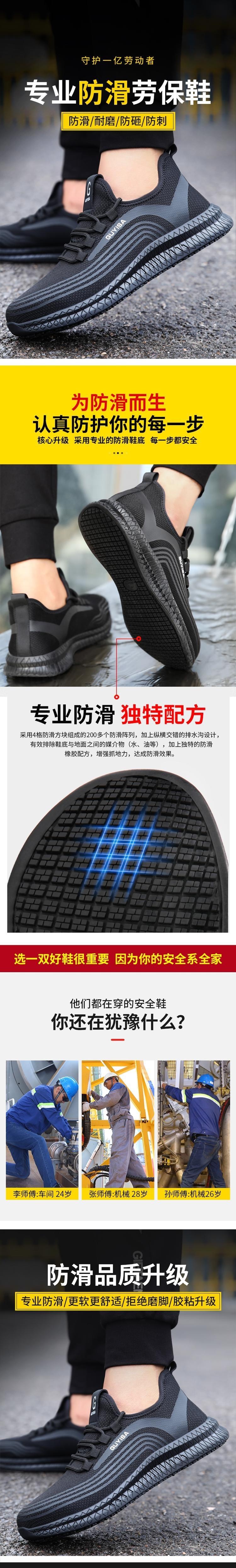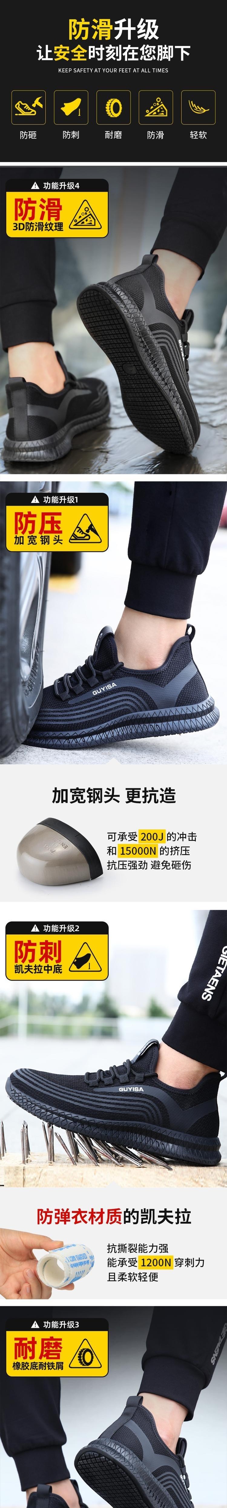 GUYISA(古伊萨) 2051-42 劳保鞋采用专业防滑设计,鞋底配备4种防滑材质组合的200多个防滑凸粒,结合上翘横空排气排水结构,有效防止油污、水渍等液体导致的打滑,提升湿滑环境下的行走安全性。
