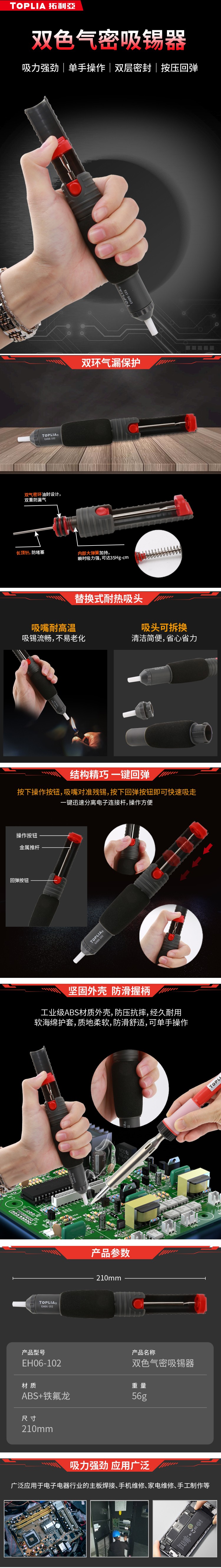 TOPLIA(拓利亚) EH06-102双环双色吸锡器采用双层密封结构设计,配备双环气密保护系统,有效防止漏气,确保吸力强劲稳定,瞬时吸力可达35Hg-cm。产品采用工业级ABS材质外壳,坚固耐用,抗压抗摔,搭配软海绵护套握柄,防滑舒适,支持单手操作,提升使用便捷性。