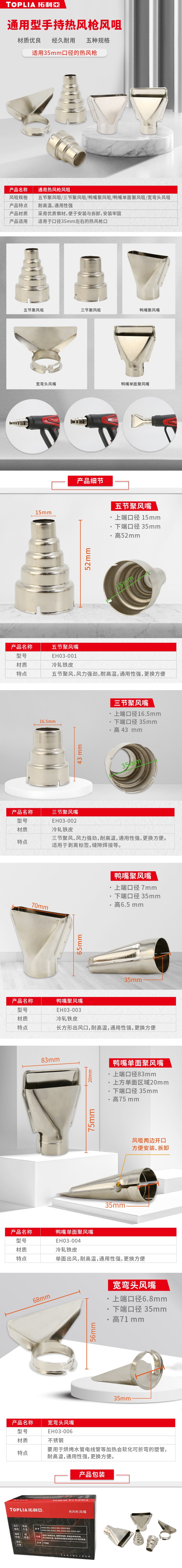 TOPLIA(拓利亚)五节聚风嘴EH03-001采用优质冷轧铁皮材质,具有良好的耐高温性能和耐用性,适用于35mm口径的热风枪。该风嘴设计为五节结构,可有效集中气流,增强热风输出的聚焦性和强度,提升加热效率。其上端口径为15mm,下端口径为35mm,整体高度达52mm,适合对精细区域进行精准加热操作。产品表面经过精细加工处理,确保气流顺畅且不易积灰,安装与拆卸便捷,配合其他型号风嘴(如三节、鸭嘴、宽弯头等)可实现多功能应用。所有风嘴均具备通用性强、更换方便的特点,满足不同工业场景下的多样化需求。