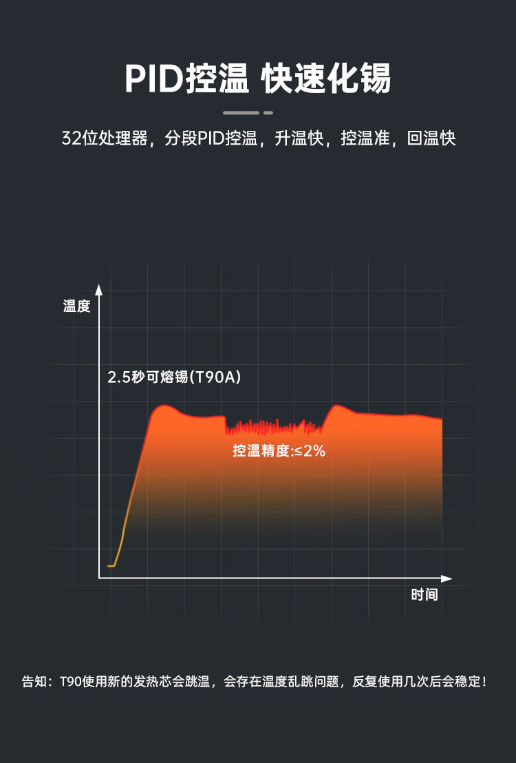 2 控温精准:采用PID分段控温技术,控温精度≤2%,控温范围80-450℃;搭载32位处理器,升温快(2-5秒化锡,T90B约3.5秒化锡)、回温快,焊接效率高。
