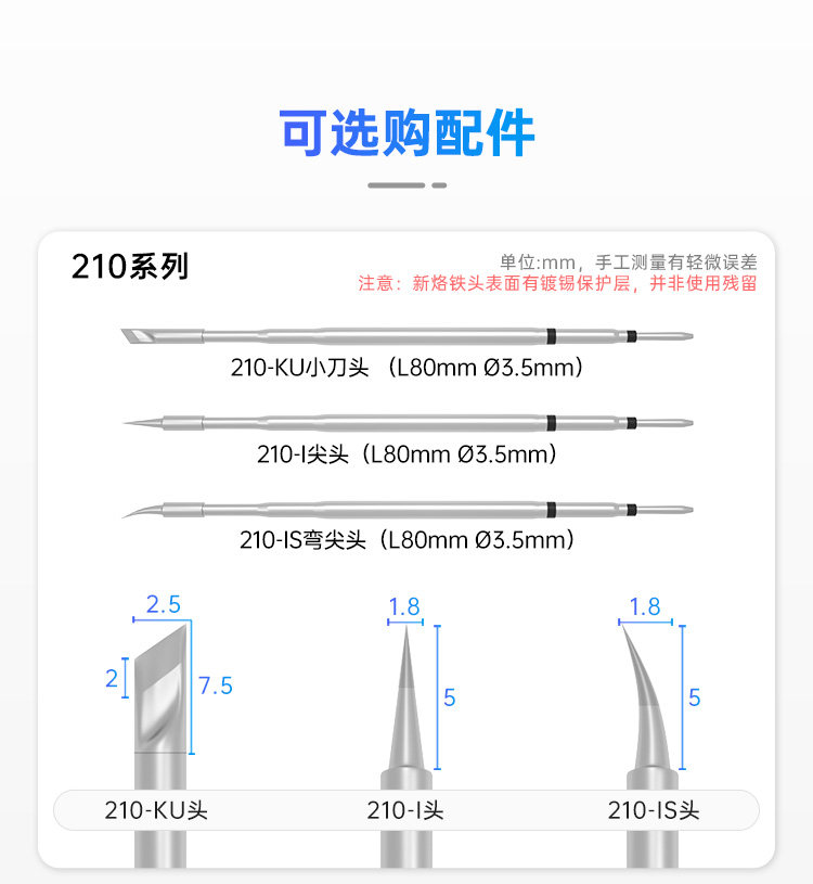 5 设计贴心:具备感应式休眠功能,放下主机进入休眠模式,拿起即可唤醒,延长发热芯寿命且省电;CNC铝合金机身,质感一流,尺寸小巧(L178mm,Φ16mm)、重量约55g,人体工学设计,握持舒适;支持多语言设置(简体中文、繁体中文等),可自定义休眠温度、待机时间、工作电压等参数,满足个性化需求;配备245-K大刀头、245-I尖头、245-IS弯尖头,适配不同焊点与焊接场景。