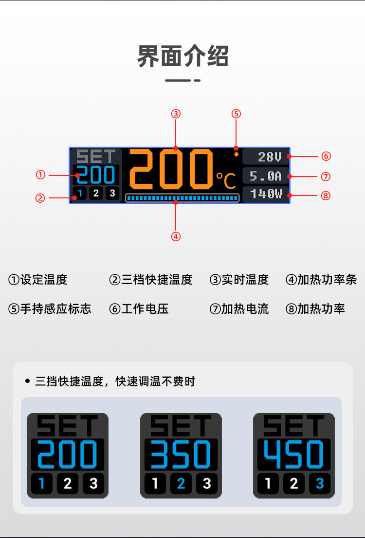 3 显示清晰:配备0.99英寸IPS LCD彩屏,显示界面绚丽,可实时显示设定温度、实时温度、工作电压、加热电流、加热功率等信息;支持三档快捷温度设置,快速调温不费时。