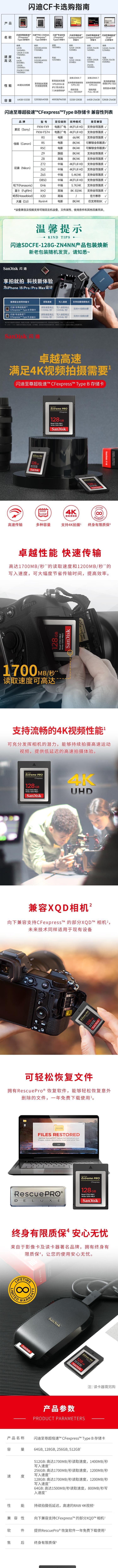 闪迪至尊超极速™ CFexpress™ Type B 存储卡(型号:SDCFE-128G-ZN4NN)采用先进的CFexpress技术,具备卓越的高速读写性能。其读取速度高达1700MB/s,写入速度可达1200MB/s,能够有效支持4K UHD视频录制及高速连拍需求。该卡支持RAW格式连续拍摄,显著降低缓存延迟,提升专业摄影效率。产品提供64GB、128GB、256GB和512GB多种容量选择,满足不同用户的数据存储需求。存储卡具备向下兼容性,可适配部分支持CFexpress™的XQD™相机设备,扩展性强。此外,产品配备RescuePro®数据恢复软件,支持一年免费下载使用,帮助用户轻松恢复意外删除或丢失的重要文件。存储卡采用坚固耐用设计,适用于高强度工作环境,并享有终身有限质保服务,保障长期使用可靠性。