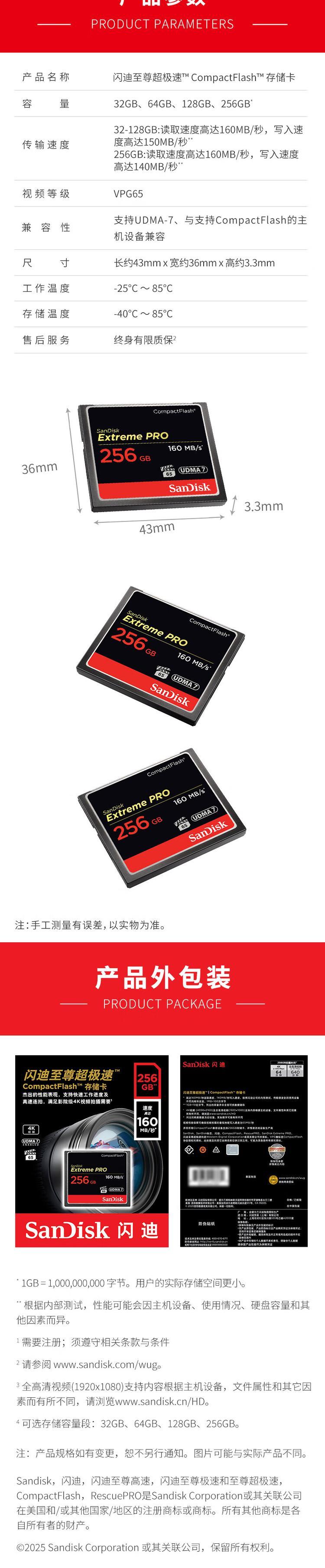 SANDISK(闪迪) CF 存储卡 256GB VPG65 UDMA 7 读速160MB/s 写速140MB/s