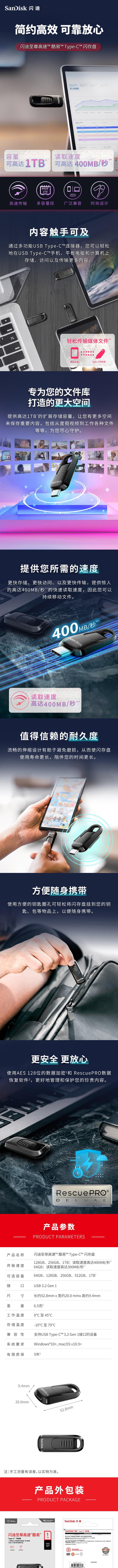闪迪至尊高速™酷易™ Type-C™ 闪存盘采用USB 3.2 Gen 1接口,提供高达400MB/秒的读取速度(64GB版本为300MB/秒),显著提升大文件传输效率。支持1TB超大容量,满足用户对高密度数据存储的需求。产品具备伸缩式设计,有效保护接口免受磨损,延长使用寿命。内置AES 128位硬件加密技术,保障数据安全,防止未授权访问。附赠RescuePRO Deluxe数据恢复软件,可在意外丢失或损坏时帮助恢复重要文件。外壳采用坚固耐用材质,配备钥匙圈孔设计,便于随身携带和防丢。兼容Windows 10+及macOS v10.9+操作系统,广泛适用于各类现代设备。