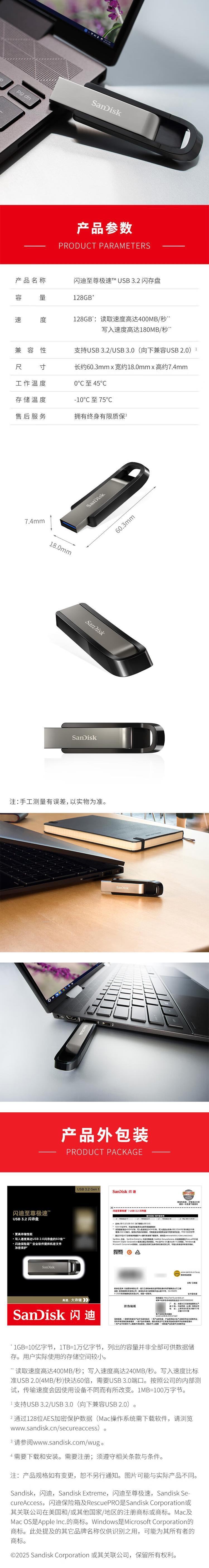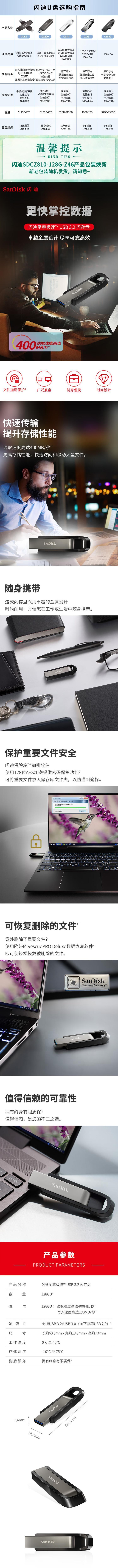本款闪迪至尊极速™ USB 3.2 闪存盘采用金属外壳设计,外观时尚且耐用,具备出色的抗摔和抗压性能。存储容量为128GB,满足日常办公、学习及专业数据传输需求。读取速度高达400MB/秒,写入速度高达180MB/秒,显著优于传统USB 2.0设备,可快速传输大型文件如高清视频、设计图纸和软件包。支持USB 3.2 Gen 1接口,向下兼容USB 3.0和USB 2.0,确保在各类设备上均可稳定使用。内置闪迪保险箱™加密软件,支持128位AES加密技术,保障重要文件的安全性,防止未经授权访问。附带RescuePRO Deluxe数据恢复软件,可在意外删除文件后进行高效恢复。产品尺寸为60.3mm × 18.0mm × 7.4mm,小巧便携,配备挂绳孔设计,便于随身携带。工作温度范围为0℃至45℃,存储温度可达-10℃至75℃,适应多种环境条件。提供终身有限质保服务,体现品牌对产品质量的高度自信。