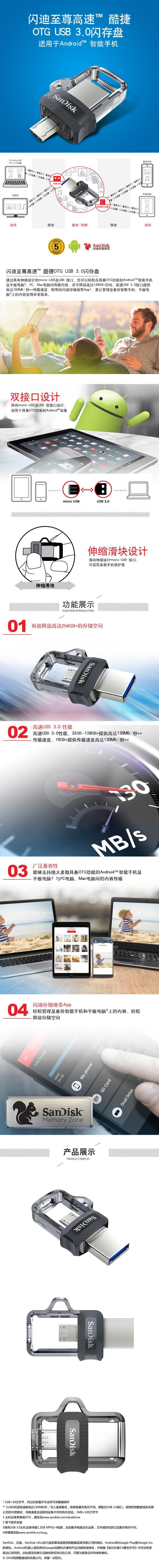 SANDISK(闪迪) 双头 USB 3.0 闪存盘 128GB 黑色 USB3.0/micro-USB 双接口 支持安卓OTG