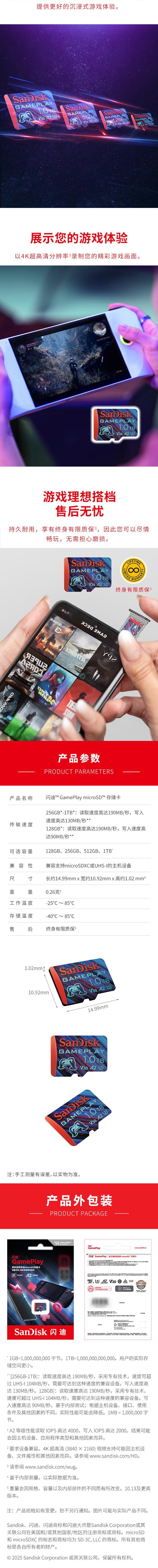 闪迪GamePlay microSD存储卡专为移动设备和掌机游戏设计,具备高达1TB的超大容量,满足用户对海量游戏存储的需求。读取速度最高可达190MB/s,写入速度最高达130MB/s(128GB版本写入速度为90MB/s),确保快速加载大型游戏和流畅运行高负载应用。支持A2等级性能,可实现高达4000 IOPS的随机读取和2000 IOPS的随机写入,显著提升多任务处理能力,实现游戏与社交、信息等应用之间的快速切换。该卡具备V30视频速度等级,支持4K超高清视频录制,适合记录高质量游戏画面。同时具备防水、耐冷热、防震等多重防护特性,适应复杂使用环境。采用UHS-I总线协议,兼容主流microSDXC设备,适用于多种便携式设备。产品提供终身有限质保,保障长期稳定使用。