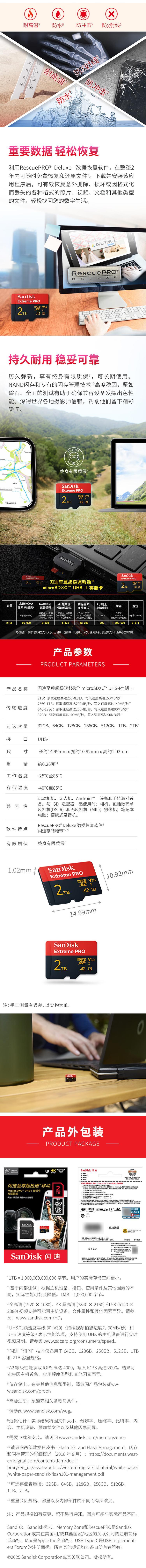 该卡支持U3与V30视频速度等级,能够稳定录制5K和4K超高清视频,尤其适合航拍、运动相机及专业摄影设备使用。具备防水、防震、耐高温低温、防X射线、防磁等多重防护特性,可在恶劣环境下稳定工作。配备终身有限质保服务,并附赠RescuePRO® Deluxe数据恢复软件,提供两年内免费恢复误删或损坏文件的功能。