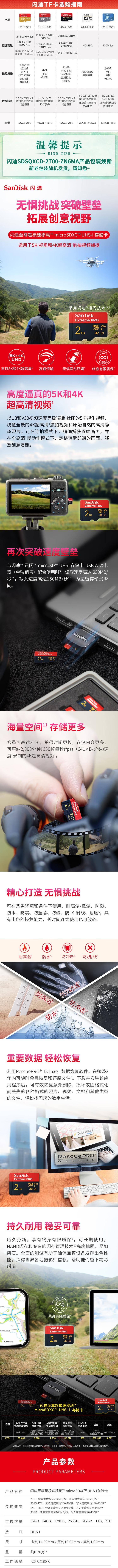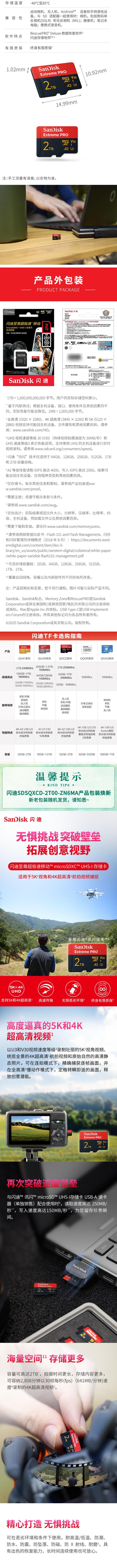 存储卡尺寸为14.99mm × 10.92mm × 1.02mm,重量约0.26克,轻巧便携,兼容各类设备如无人机、运动相机、数码单反、摄像机、笔记本电脑及Android设备等。支持通过闪迪讯闪技术读卡器实现更快的数据传输效率。