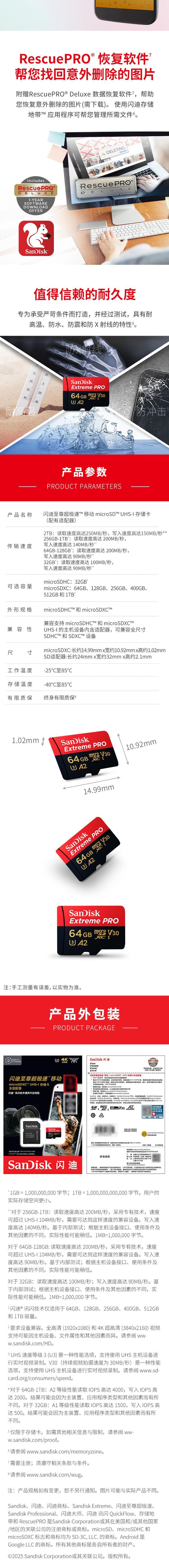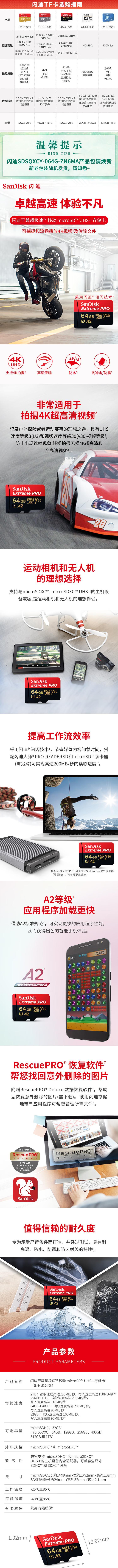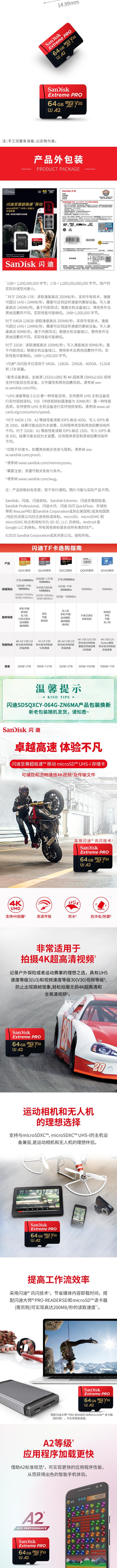该产品为闪迪(SanDisk)至尊超极速™移动microSD™ UHS-I存储卡,型号SDSQXCY-064G-ZN6MA,容量为64GB,属于microSDXC规格。采用UHS-I总线协议,具备U3速度等级和V30视频速度等级,支持4K超高清视频录制,确保在高码率下稳定拍摄不丢帧。同时具备A2应用性能等级,可实现更快的应用程序加载与运行,提升智能手机等设备的使用体验。