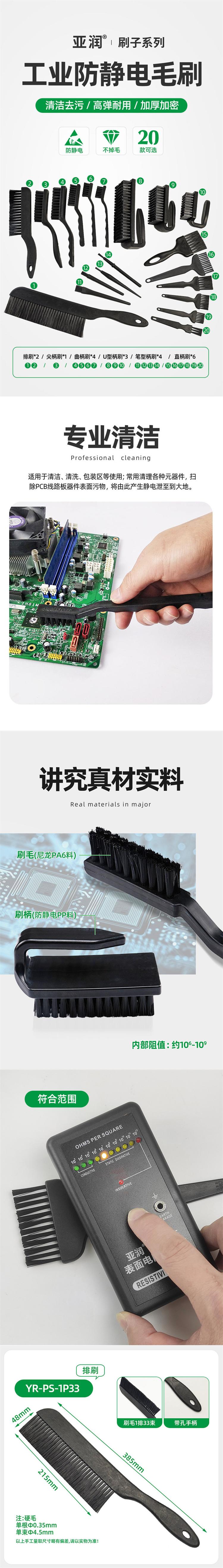 本款YARUN-YR-PS-1P33防静电毛刷专为工业电子清洁设计,采用高品质尼龙PA6材质刷毛,具有高弹性、耐磨性强、不掉毛的特点,确保长时间使用仍保持良好清洁效果。刷柄选用防静电PP材料,内部电阻值约为10^6-10^9欧姆,有效防止静电积聚,避免对敏感电子元件造成损害。刷头为U形曲柄结构,配备1排33孔密集刷毛,单根刷毛直径0.35mm,单束直径4.5mm,适合深入狭小空间进行精细清洁。整体尺寸为长385mm、宽48mm、刷毛长度215mm,配备带孔手柄,便于悬挂收纳,提升工作场所整洁度。产品符合国际防静电标准,适用于各类PCB线路板、元器件表面的污渍清除与除尘作业。