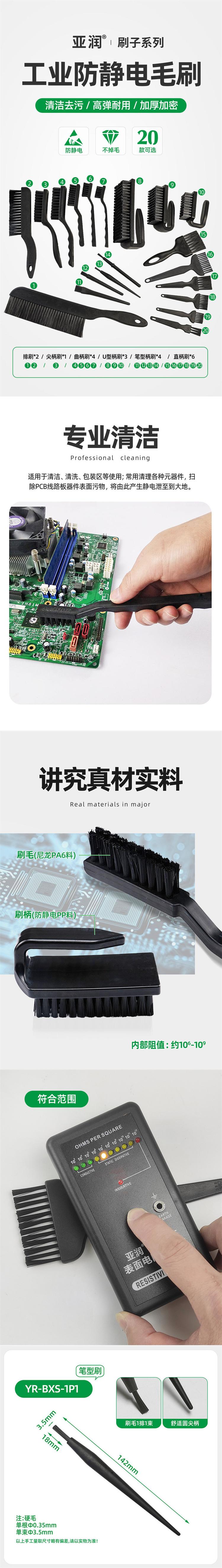 该产品为亚润(YARUN)品牌工业防静电毛刷,型号YARUN-YR-BXS-1P1,采用笔型设计,适用于精密电子元件的清洁作业。刷头为U形曲柄结构,搭配黑色防静电PP材质刷柄,具备良好的人体工学设计,操作灵活便捷。