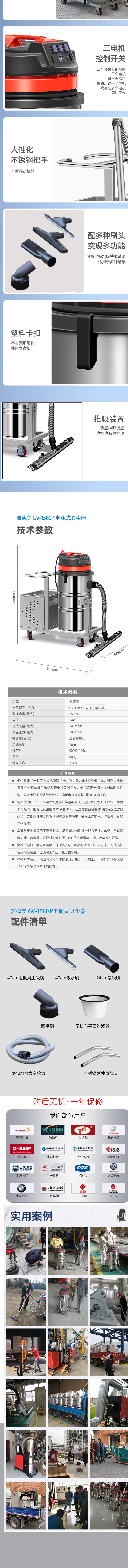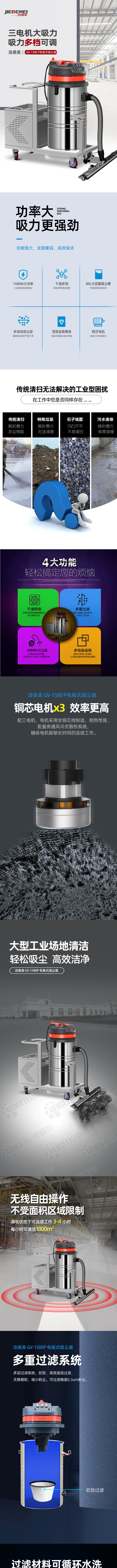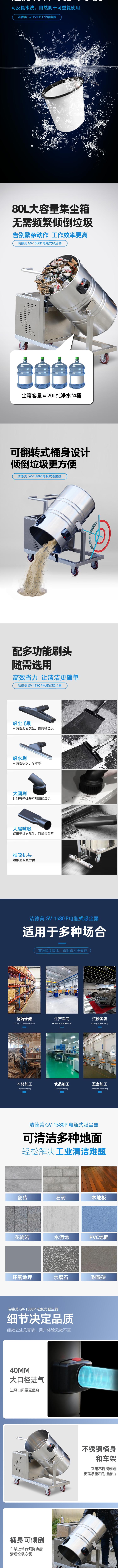 洁德美GV-1580P电瓶式工业吸尘器采用三电机独立驱动设计,总功率高达1500W,提供强劲吸力,满足高强度工业清洁需求。配备80L大容量不锈钢集尘箱,容量相当于约4桶20L纯净水,有效减少倾倒频率,提升工作效率。集尘箱支持可翻转式设计,倾倒垃圾更加便捷,避免二次污染。整机采用全铜芯电机,耐热性强,配合涡轮式风机结构和高效散热系统,确保长时间连续运行稳定可靠。过滤系统采用多层高效滤网,过滤精度可达0.3μm,有效捕捉微小粉尘,防止二次扬尘。过滤材料可反复水洗,自然阴干后可重复使用,降低维护成本。机器配备40mm大口径进气口,进风顺畅,吸力更强劲。机身采用不锈钢材质制造,具有高承载能力和优异的耐用性,适用于恶劣工业环境。同时配备多种刷头附件,包括40cm地板用主吸嘴、40cm吸水刷、24cm扁吸嘴、吸尘毛刷、大圆刷、推吸扒头等,适应不同清洁场景需求。无线设计,满电状态可持续工作3-4小时,每小时可清洁面积达1800平方米,不受电源线限制,操作自由灵活。产品还具备过热保护功能,保障设备安全运行。