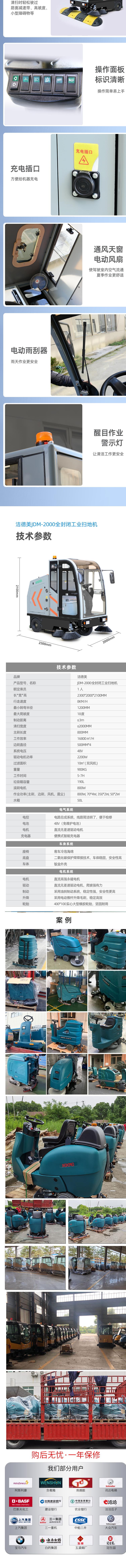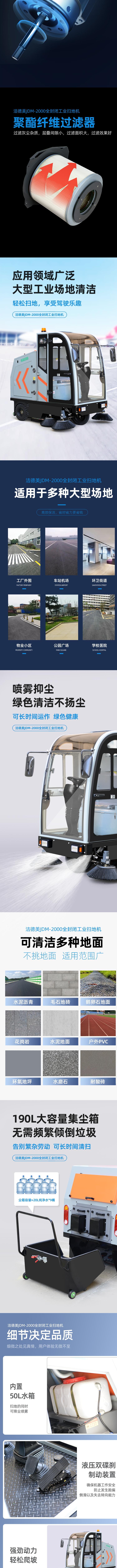 洁德美JDM-2000全封闭电动扫地车是一款集清扫、吸尘、喷雾抑尘于一体的高性能工业清洁设备,具备高效、智能、环保等多重优势。其清扫宽度达2000mm,单次作业可覆盖大面积区域,显著提升清洁效率。配备190L大容量集尘箱,有效减少倾倒垃圾频次,适合长时间连续作业。采用V型浮动滚刷设计,能紧密贴合地面,深入缝隙清理灰尘与杂物,尤其适用于粗糙路面、瓷砖拼接处等难以清洁的死角。高浓度尼龙边刷配合双效合一结构,实现扫地与吸尘同步进行,彻底清除落叶、石子、纸屑等多种废弃物。搭载工业级大容量电池,满电续航可达5-7小时,满足全天候作业需求。直流无差速驱动电机提供强劲动力,确保在复杂地形下稳定运行,轻松应对爬坡及不平路面。内置50L水箱支持边扫边喷雾,有效抑制扬尘,实现绿色清洁。车辆配备聚酯纤维过滤器,过滤精度高,过滤面积大,保障空气质量。驾驶舱全封闭设计,搭配电动雨刮器、通风天窗和电动风扇,提升操作舒适性与安全性。操作面板标识清晰,按键布局合理,便于快速上手。液压双碟刹制动系统确保行车安全,防止侧滑或失控。整体采用钣金外壳,坚固耐用,适应各种严苛工况环境。