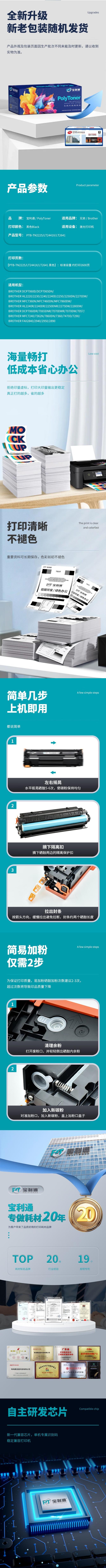 宝利通(PolyToner)PTB-TN2225/LT2441X/LT2641硒鼓专为兄弟(Brother)系列激光打印机设计,具备高兼容性与稳定性能。产品采用自主研发的兼容芯片技术,支持单机专属识别码,确保在多种机型上实现稳定兼容,避免频繁报错或无法识别的问题。该硒鼓标准容量可打印约2600页,满足中高强度办公打印需求,有效降低单位打印成本。