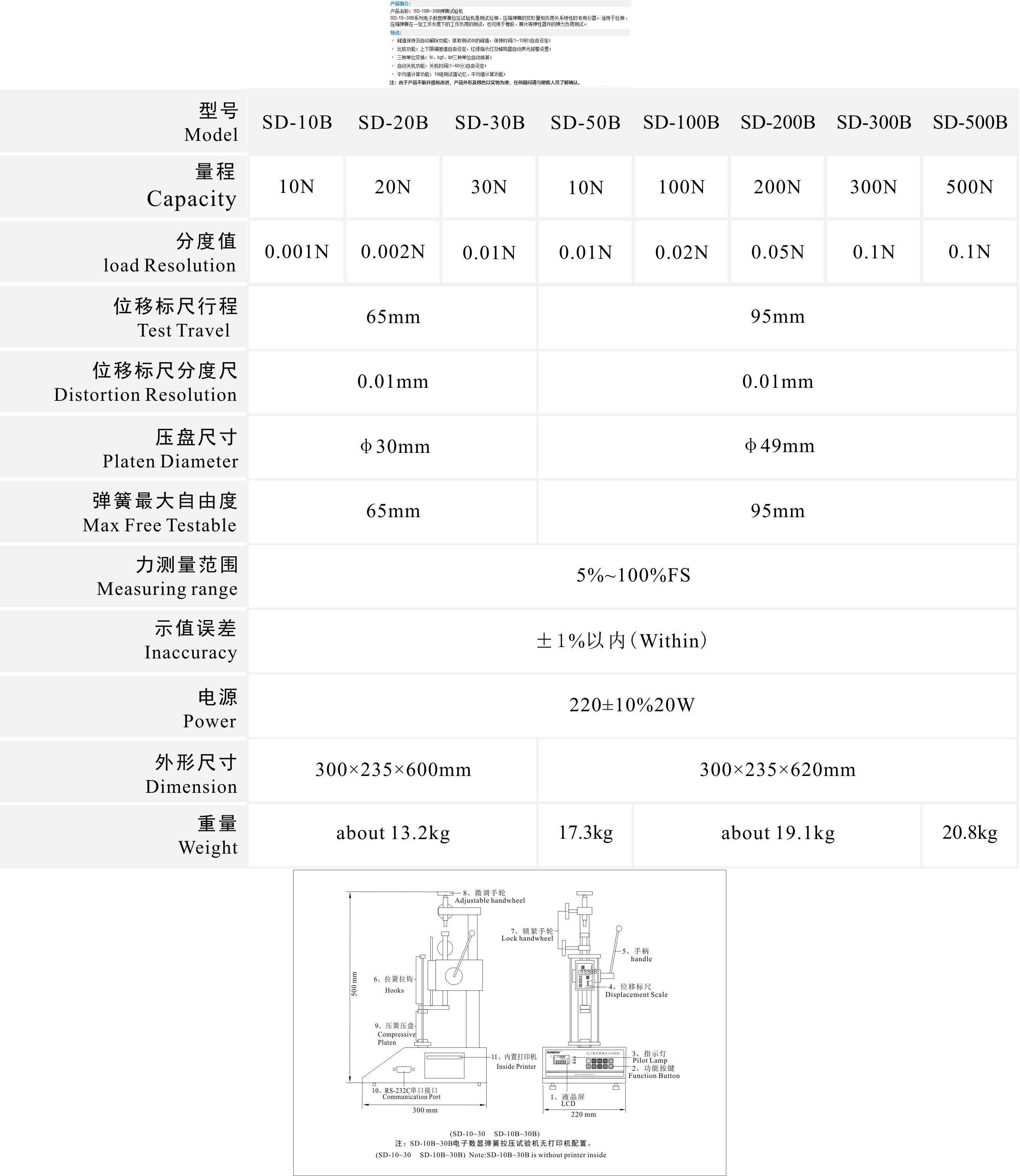 参数层面:量程为200N,分度值0.05N;位移标尺行程95mm,位移标尺分度尺精度0.01mm;压盘尺寸φ49mm,弹簧最大自由测试度95mm;力测量范围为5% - 100%FS,示值误差在±1%以内;电源适配220±10% 20W,外形尺寸300×235×620mm,重量约19.1kg。