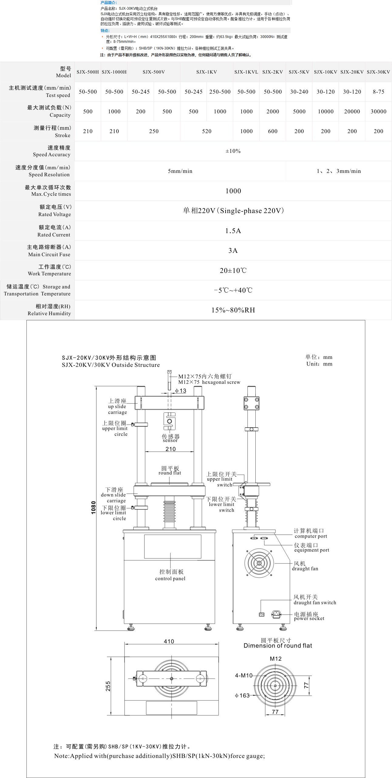 2 性能参数:最大试验负荷达30000N,测试速度范围8 - 75mm/min,速度精度±10%,最大单次循环次数1000次,能满足多种力学性能测试的负荷、速度与循环测试需求;额定电压为单相220V,额定电流1.5A,主电路熔断器3A,适配常规供电环境。