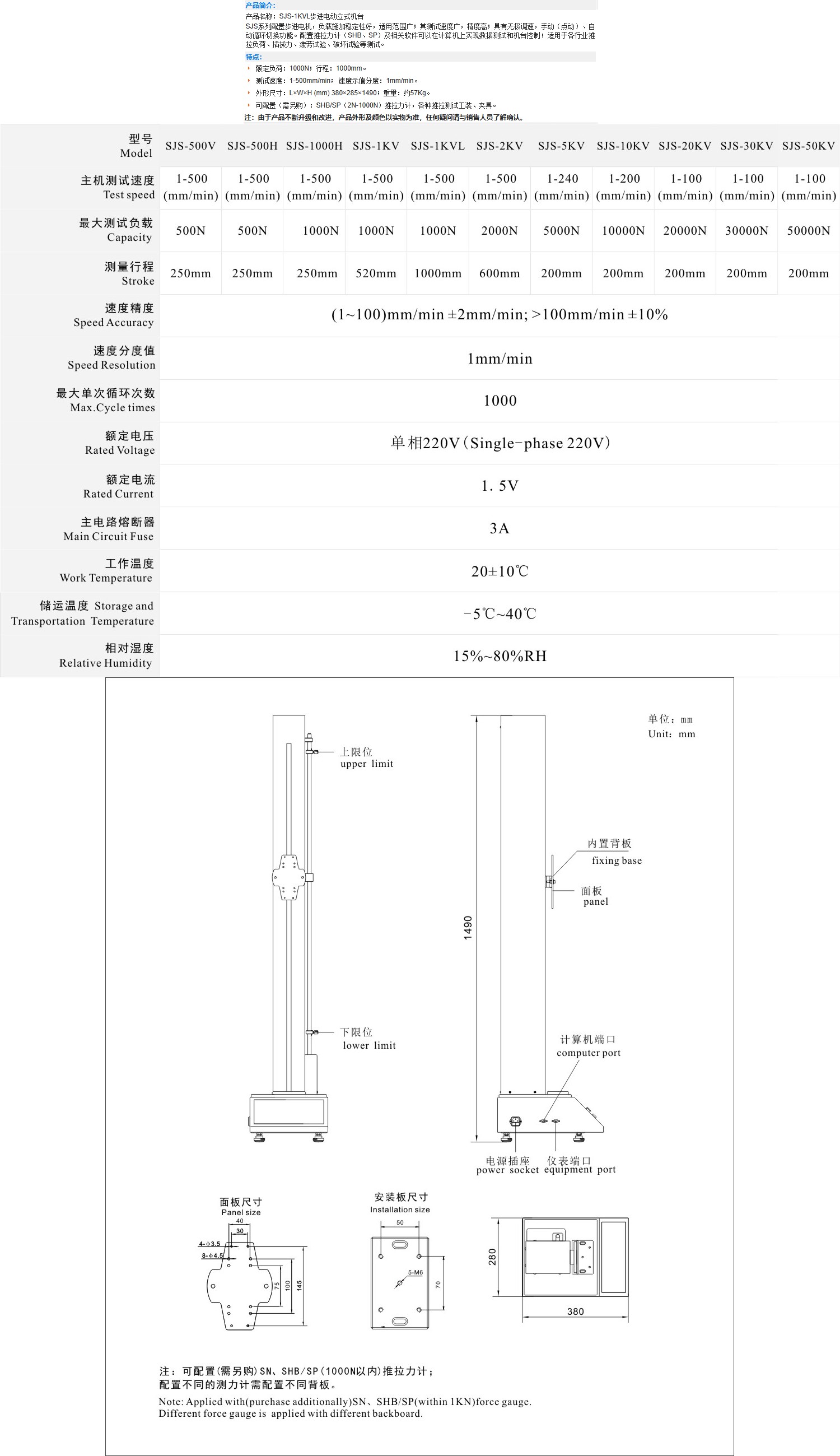 品牌为SUNDOO(山度),型号SJS-1KVL,属于步进电动立式机台;配置步进电机,负载施加稳定性好,适用范围广;测试速度范围1-500mm/min,速度分度值1mm/min,速度精度(1~100)mm/min ±2mm/min、>100mm/min ±10%;额定负荷1000N,行程1000mm,最大单次循环次数1000次;具备无极调速,支持手动(点动)、自动循环切换功能;可配置SHB/SP(2N-1000N)推拉力计及相关软件,实现计算机端数据测试与机台控制,也可配置各类推拉力测试工装、夹具(需另购配件);外形尺寸(长×宽×高)380×285×1490mm,重量约57Kg;额定电压为单相220V,额定电流1.5A,主电路熔断器3A;工作温度20±10℃,储运温度-5℃~40℃,相对湿度15%~80%RH。