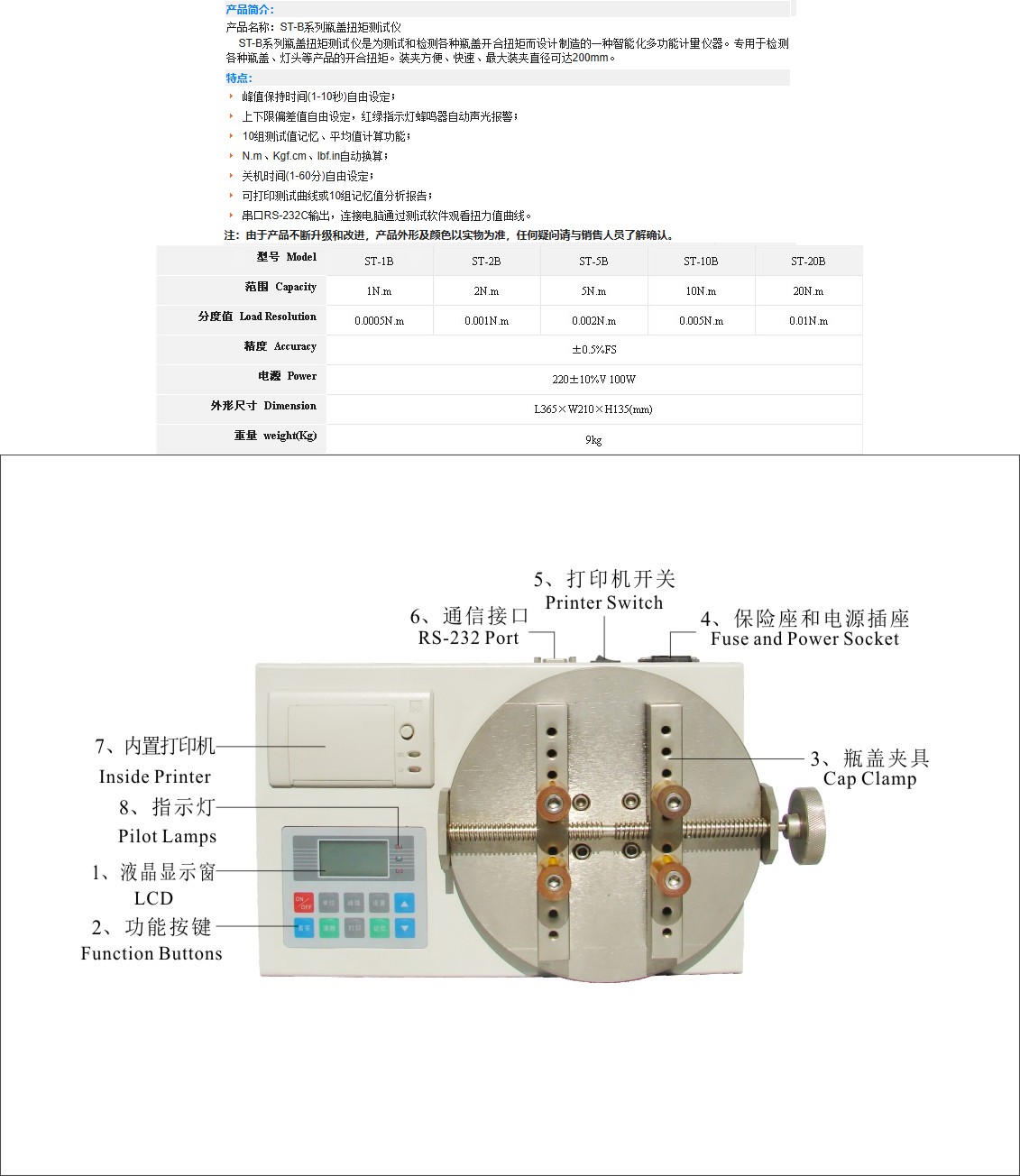 品牌为山度(SUNDOO),型号ST - 10B的瓶盖扭矩测试仪,专为检测瓶盖、灯头等产品的开合扭矩而设计,是智能化多功能计量仪器。- 装夹与量程:装夹方便、快速,最大装夹直径可达200mm;量程为10N·m,分度值0.005N·m,精度±0.5%FS。- 功能设置:峰值保持时间(1 - 10秒)可自由设定;上下限偏差值自由设定,配备红绿指示灯及蜂鸣器,可自动声光报警;具备10组测试值记忆、平均值计算功能;支持N·m、Kgf.cm、lbf.in单位自动换算;关机时间(1 - 60分钟)可自由设定;可打印测试曲线或10组记忆值分析报告;通过串口RS - 232C输出,连接电脑后可借助测试软件查看扭力值曲线。- 其他参数:电源为220±10%V、100W;外形尺寸L365×W210×H135(mm),重量9kg。