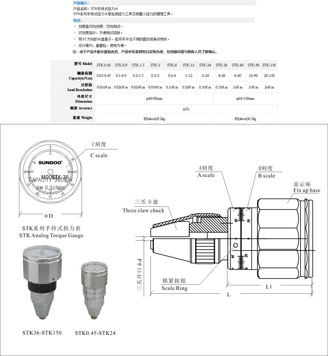 品牌为SUNDOO(山度),型号STK - 3,属于STK系列手持式扭力计,是检测扭力工具和测量小扭力的理想工具。- 刻度盘双向刻度,支持双向测试,可满足不同方向的扭力测量需求;- 双刻度指示,读数便捷,便于测试时快速获取准确数据;- 配备3个方向的卡盘,能牢固卡住不同的圆状或角状物体,适配多种被测物形状;- 设计精巧,重量轻(约0.2kg),使用方便,便于手持操作和携带;- 测量范围为0.3 - 3cN·m,分度值0.05cN·m,精度±5%,外形尺寸φ44×93mm,保证测量精度与便携性。