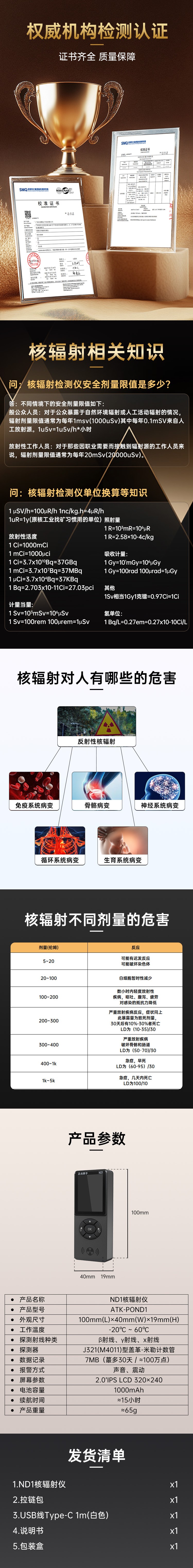 报警方式:支持声音和振动双重报警,当辐射值超标或触发报警条件时,能及时提醒,保障使用安全。