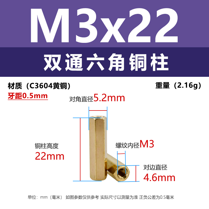 新宏辉达 黄铜双通六角铜柱 PCBA主板紧固隔离螺柱 H4.6*M3*22 STTZ3027