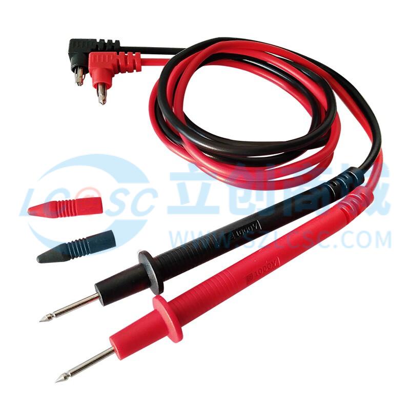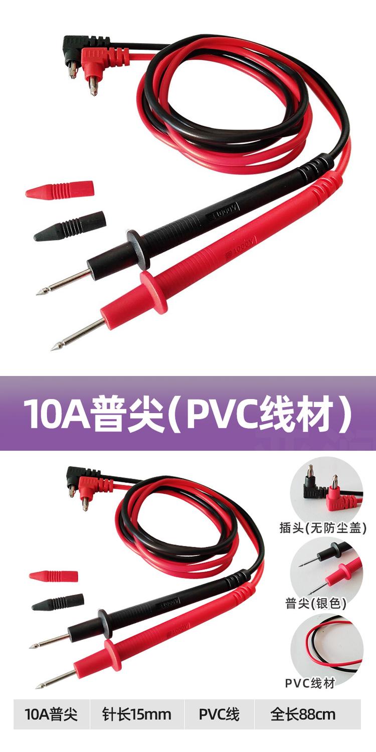 表笔设计:普尖(银色)结构,针长15mm,可精准接触测试点;表笔主体红黑双色区分(红色对应正极、黑色对应负极),搭配防滑手柄,握持舒适,操作时不易滑动,提升测试稳定性;插头为无防尘盖的弯插头设计,适配多数万用表、钳形表的接口。