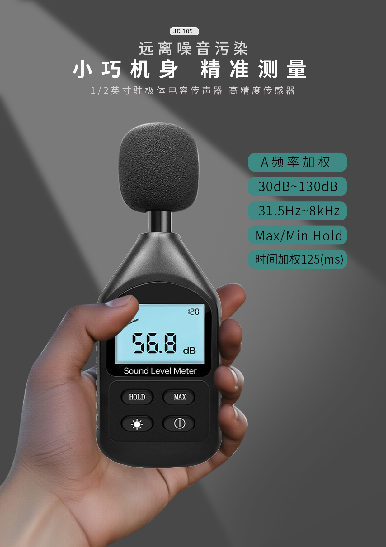 品牌与型号:JLDG JD-105手持式噪音计,小巧机身设计,便于手持操作,适配多场景快速测量需求。
