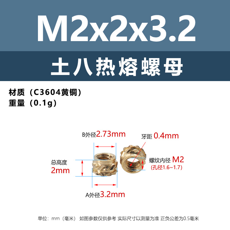 规格精准:型号SZTB1061,尺寸参数为M2x2x3.2(总高度2mm,A外径3.2mm,B外径2.73mm,牙距0.4mm,螺纹内径M2、孔径1.6~1.7mm),重量仅0.1g,小巧轻便。