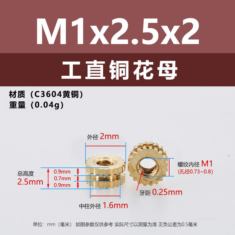 新宏辉达 工王直铜热熔注塑螺母工直通孔嵌件预埋滚花铜螺母M1.0*2.5*2 SZGZ1804