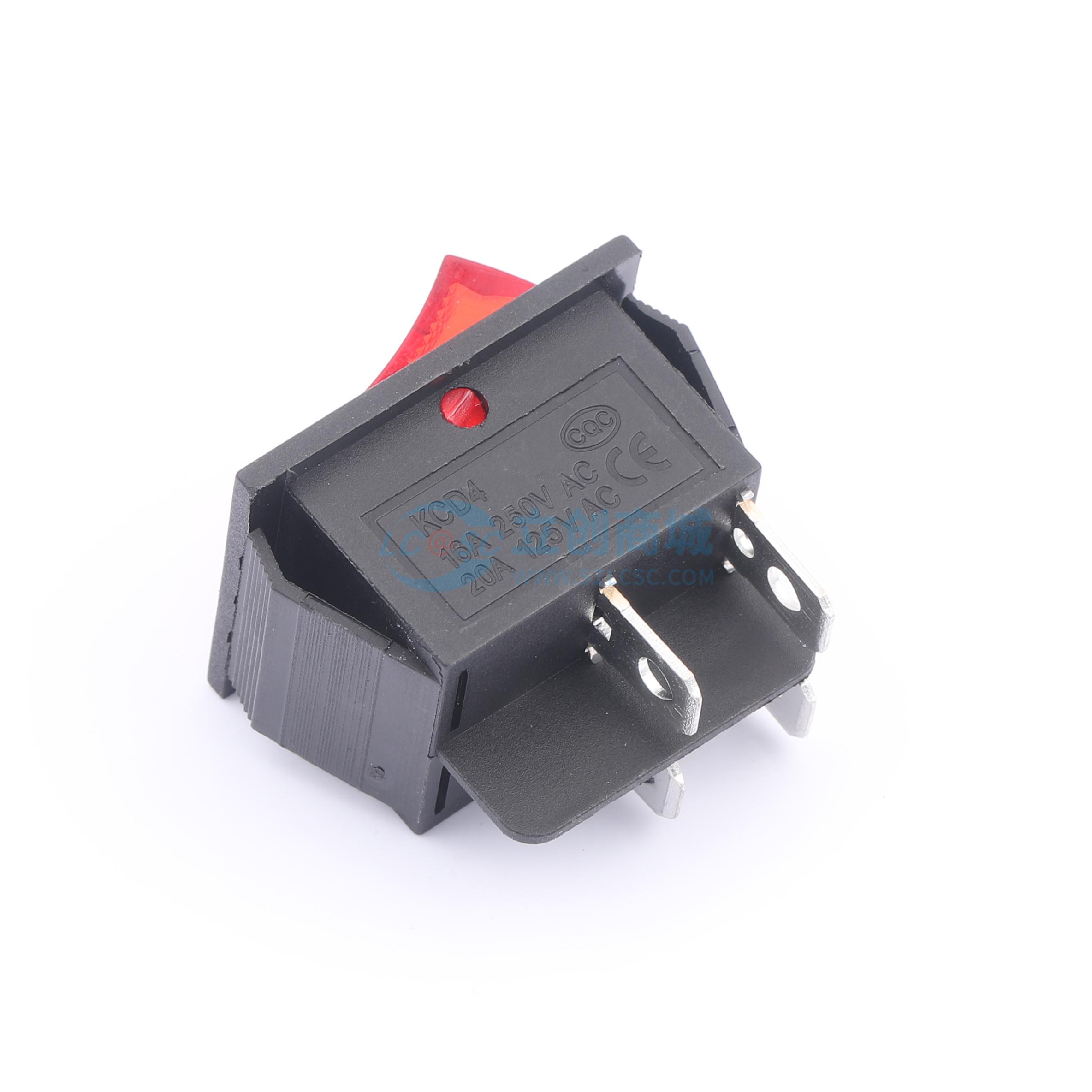 结构设计:4脚2档翘板开关,带红色指示灯,便于直观判断开关状态