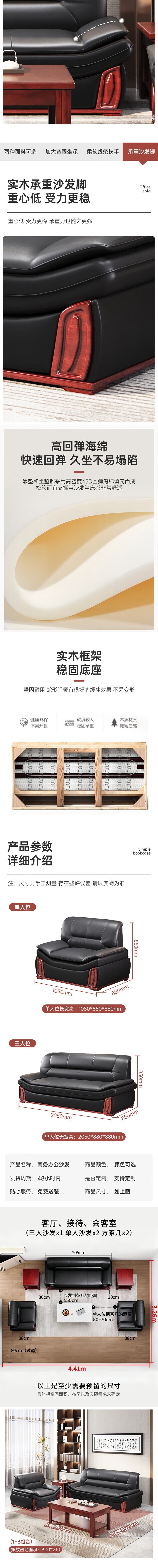 荣将办公室沙发3+1+1+长茶几组合商务接待沙发会客洽谈皮沙发