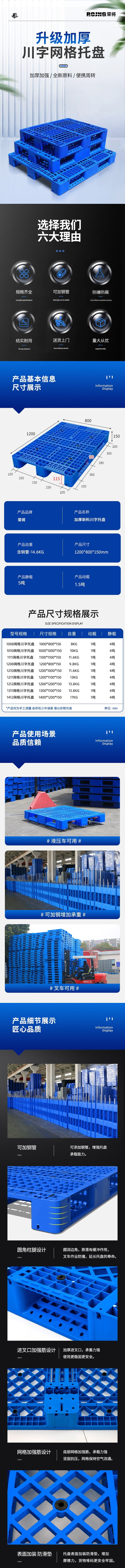 荣将塑料托盘叉车货架托盘仓库防潮板网格川字托盘120*80*15cm加8钢