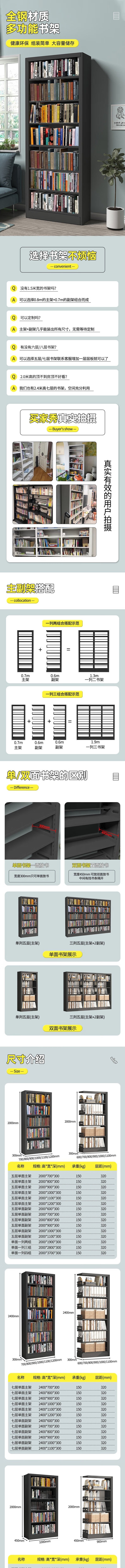 荣将 书架钢制家用书柜落地图书馆书架收纳置物架 800宽7层主架