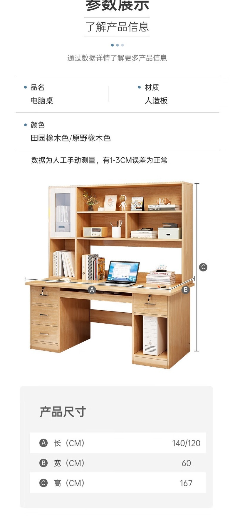 荣将简约现代宽带抽屉一体化办公桌电脑桌学习桌工作台三抽款1.2米