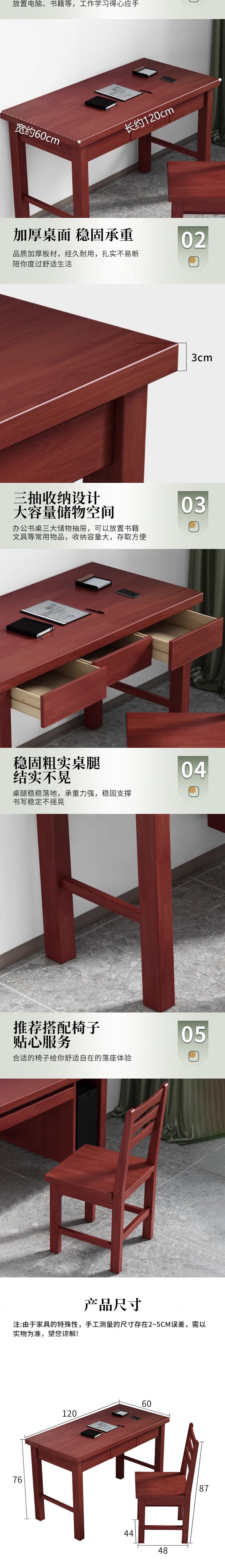 荣将1.2米实木办公桌电脑桌简约学习桌写字台工作台三抽含两椅榉木色