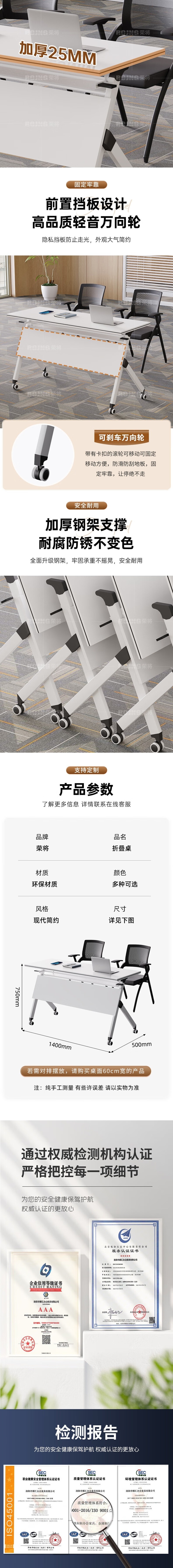 荣将折叠会议桌培训桌椅组合双人课桌带轮可移动办公桌1.4*0.5米含2椅