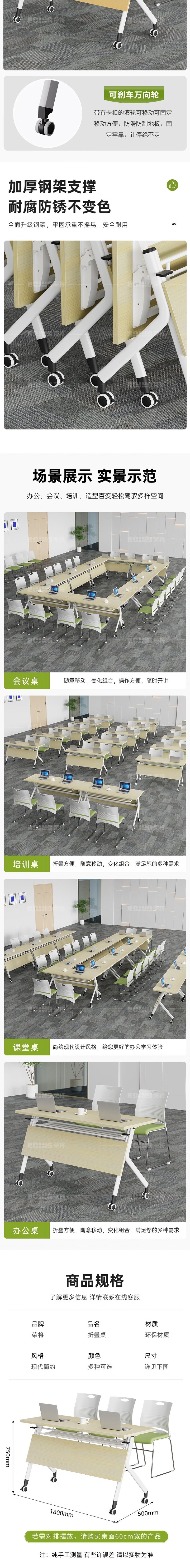 荣将折叠会议桌培训桌椅组合三人课桌带轮可移动办公桌1.8*0.5米含3椅